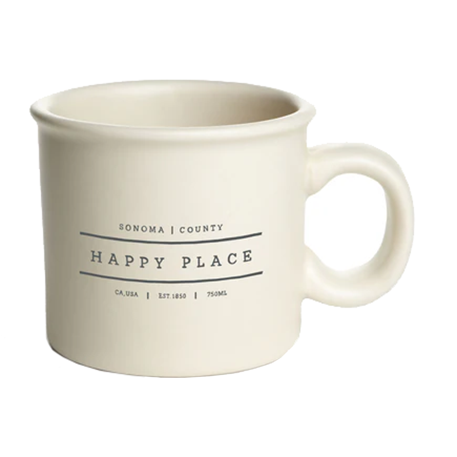 We think it's a Happy Place because we live and work here, and we hope you'll find it that way too! This chunky 12 oz. mug might just be the perfect reminder of happy times here in Sonoma County. Charcoal grey printing on cream mug, and Made in America.