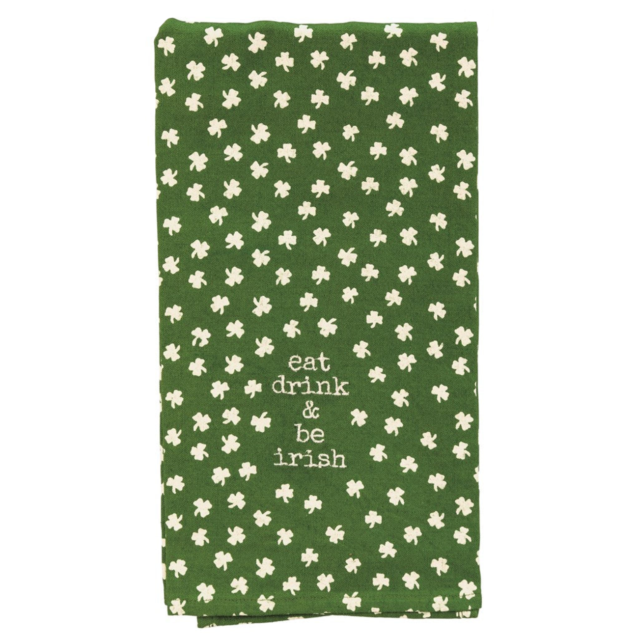 A cotton kitchen blend dish towel featuring an all-over shamrock pattern with an embroidered "Eat Drink & Be Irish" sentiment. Machine-washable.