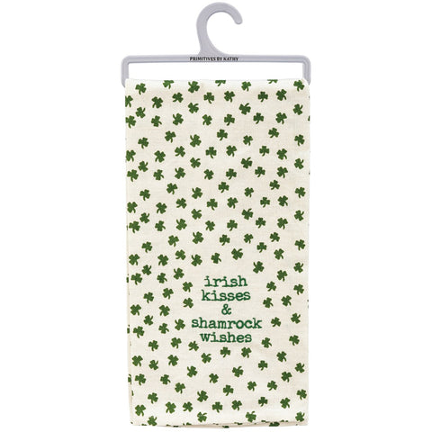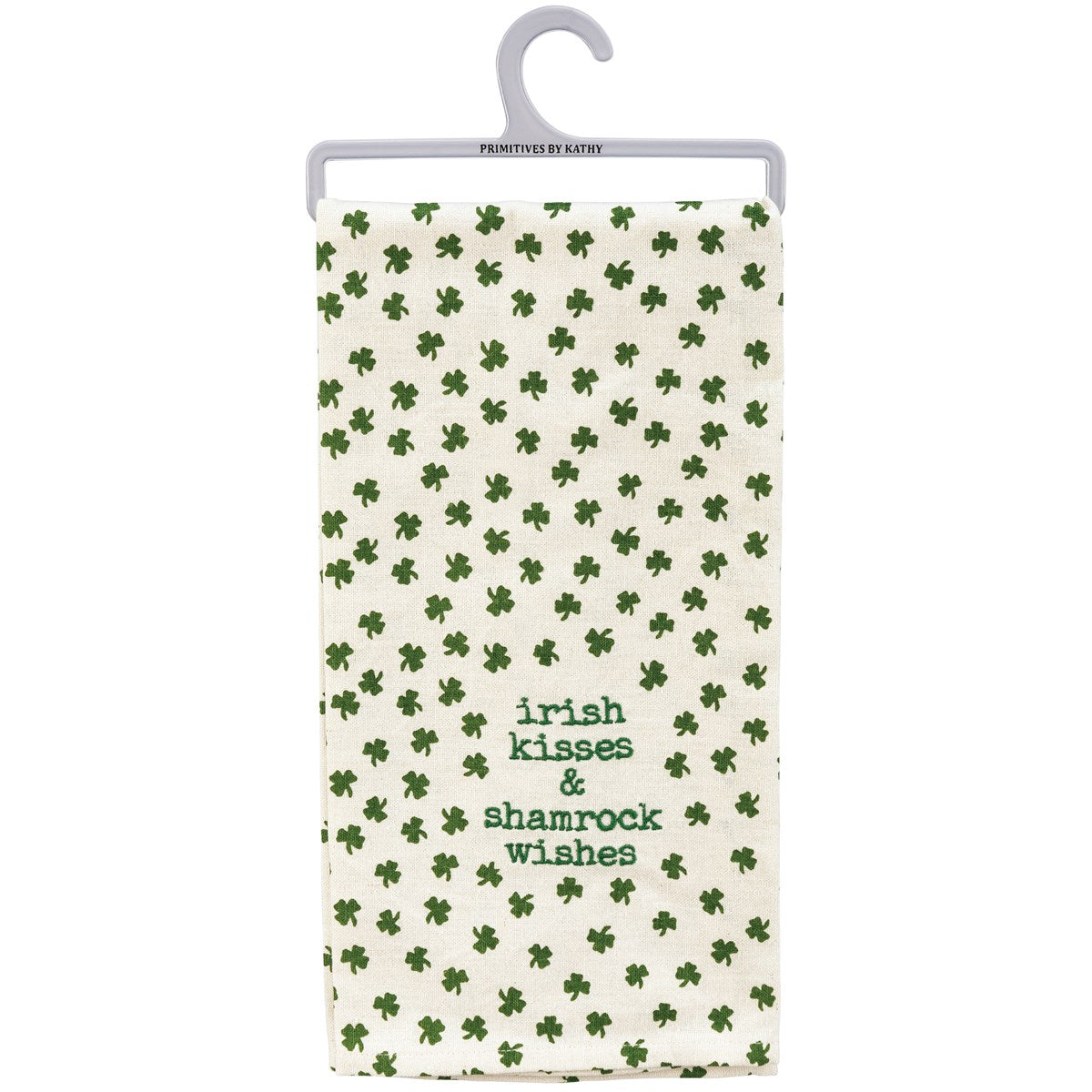 A cotton linen blend kitchen towel featuring an all-over shamrock pattern with an embroidered "Irish Kisses & Shamrock Wishes" sentiment. Machine-washable.