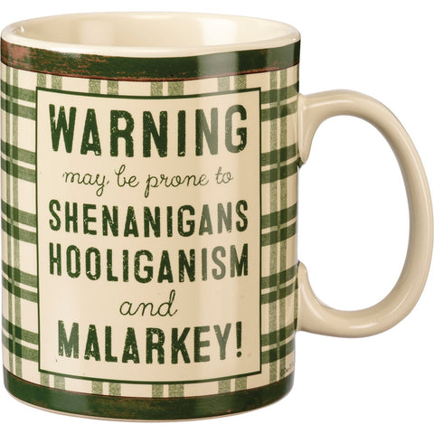 A fun stoneware mug featuring a green plaid design and "Warning - May Be Prone To Shenanigans, Hooliganism, and Malarkey!"