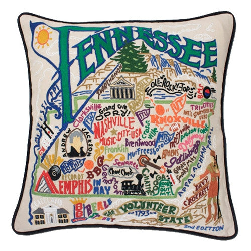 This pillow is a delightful keepsake for remembering where you came from, where you've been, where you are, and where you'd like to go! Great for gift giving, or to adorn your own comfy, cozy couch. Each and every pillow is entirely embroidered by hand, and is finished with velvet piping around the edges.