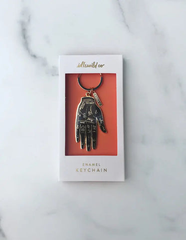 A brass and enamel "hand" key chain that makes for an eye-catching accessory! Perfect for the palm readers and psychics in your life! Made with vibrant hard-enamel and polished to a shine.