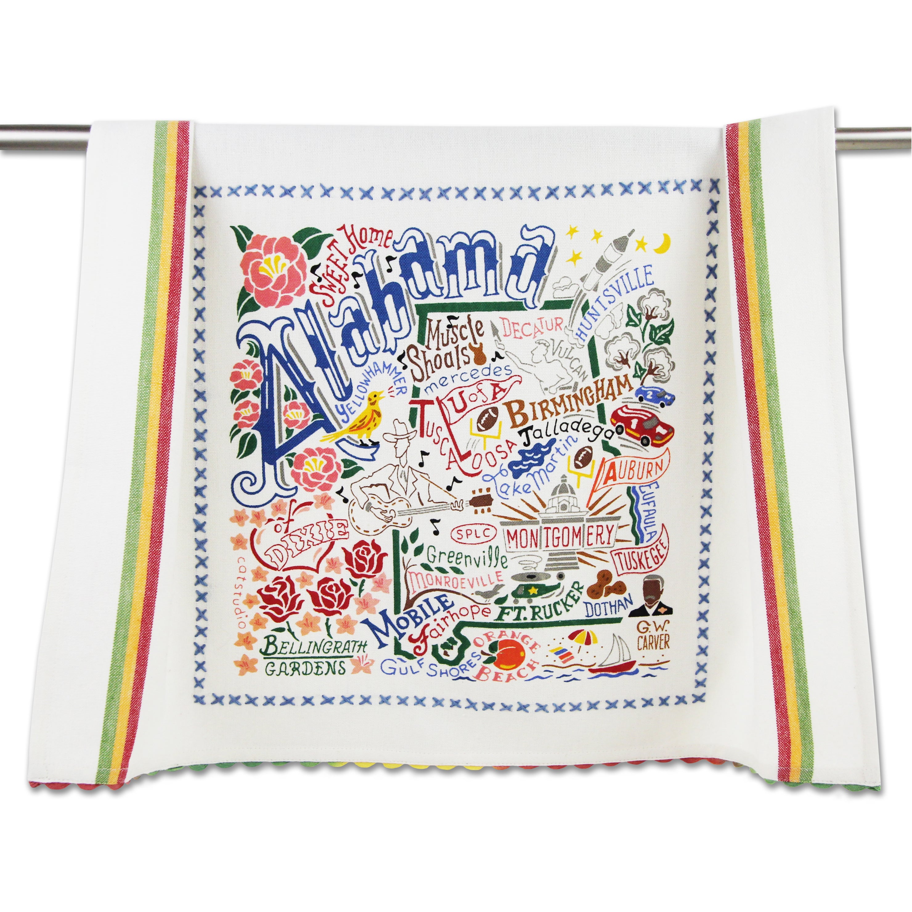 This colorful Alabama design is silk-screened, then framed with a hand embroidered border on a 100% cotton dish towel. Three stripes down both sides and hand dyed rick-rack at the top and bottom add a charming vintage touch. Delightfully presented in a fun & fabulous organdy re-usable pouch!