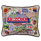 This colorful Arizona design is silk-screened, then framed with a hand embroidered border on a 100% cotton dish towel. Three stripes down both sides and hand dyed rick-rack at the top and bottom add a charming vintage touch. Delightfully presented in a fun & fabulous organdy re-usable pouch!