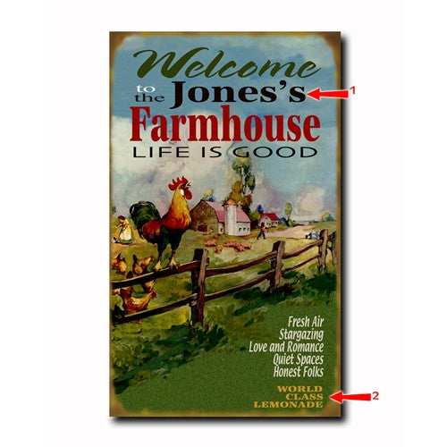 Only the lines with red arrows can be personalized. Just fill in the custom text boxes above with personalization for each line. Please be as specific as possible, and if you have any questions, give us a call!