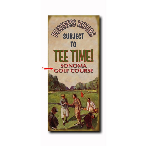 This Golf Hours sign is handcrafted in the USA of either wood or metal...take your pick! Sign measures 10-1/2" x 24".Only the line with a red arrow can be personalized. Please fill in the custom text box above.