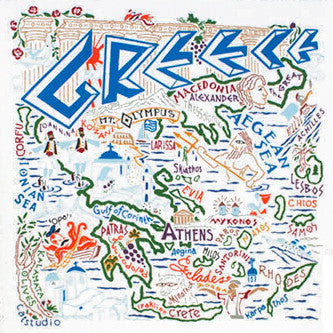 This colorful Greece design is silk-screened, then framed with a hand embroidered border on a 100% cotton dish towel. Three stripes down both sides and hand dyed rick-rack at the top and bottom add a charming vintage touch. Delightfully presented in a fun & fabulous organdy re-usable pouch!