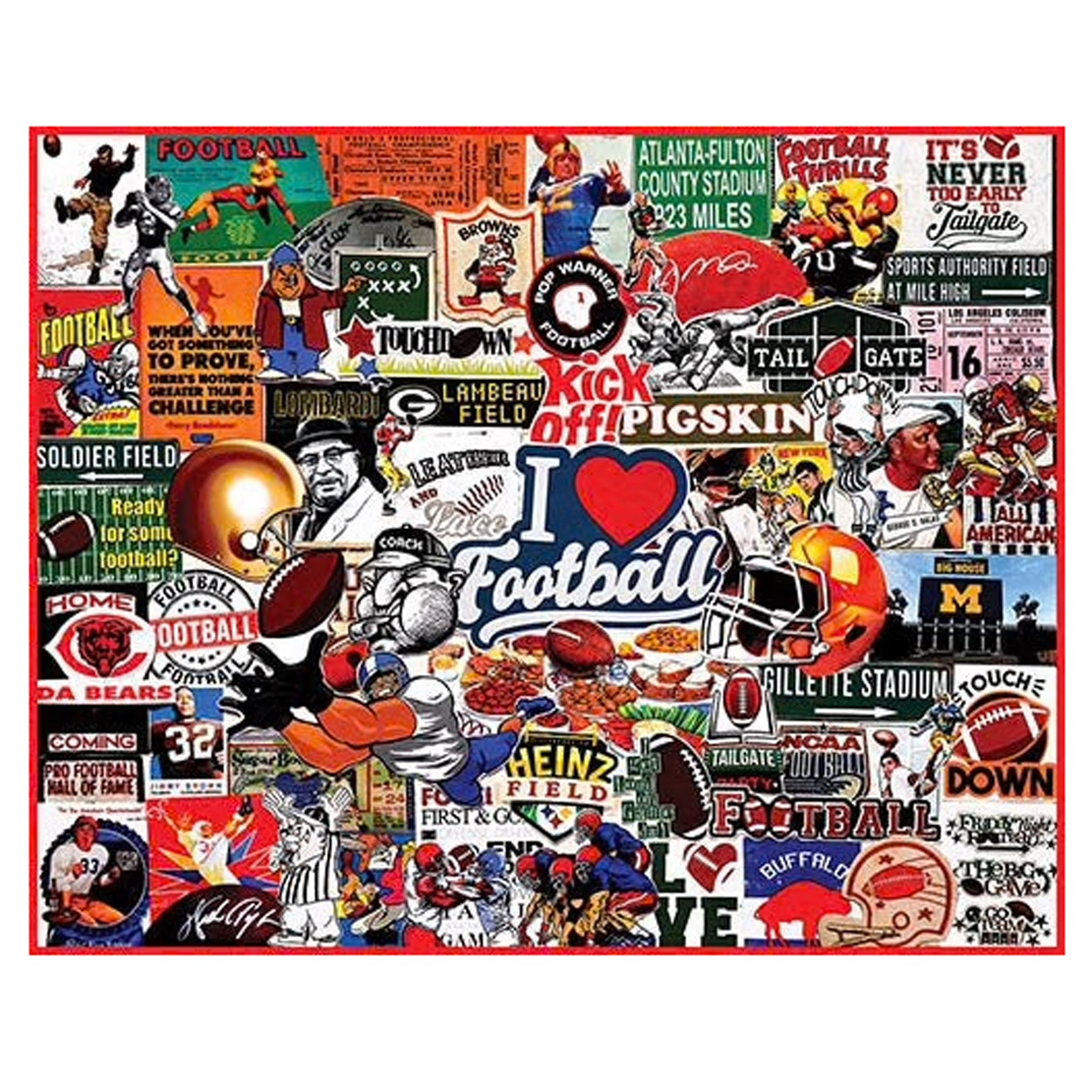 Calling all football fans. Artist Charlie Girard has gathered slogans, stadium names, famous players, and more in this 1000 piece collage style jigsaw puzzle. Finished size 24" x 30"