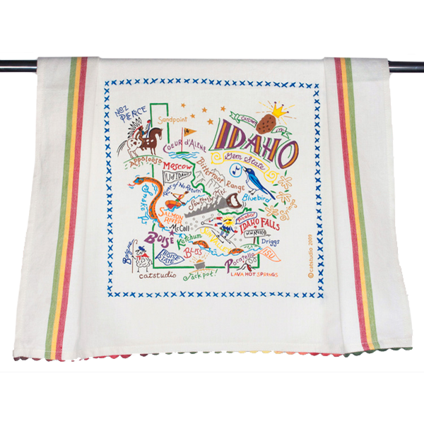 This colorful Idaho design is silk-screened, then framed with a hand embroidered border on a 100% cotton dish towel. Three stripes down both sides and hand dyed rick-rack at the top and bottom add a charming vintage touch. Delightfully presented in a fun & fabulous organdy re-usable pouch!