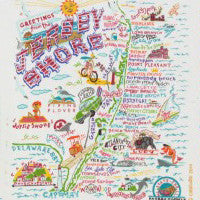 This colorful Jersey Shore design is silk-screened, then framed with a hand embroidered border on a 100% cotton dish towel. Three stripes down both sides and hand dyed rick-rack at the top and bottom add a charming vintage touch. Delightfully presented in a fun & fabulous organdy re-usable pouch!