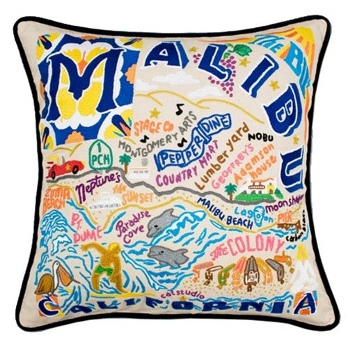 This Malibu pillow is a delightful keepsake for remembering where you came from, where you've been, where you are, and where you'd like to go! Great for gift giving, or to adorn your own comfy, cozy couch. Each and every pillow is entirely embroidered by hand, and is finished with velvet piping around the edges.