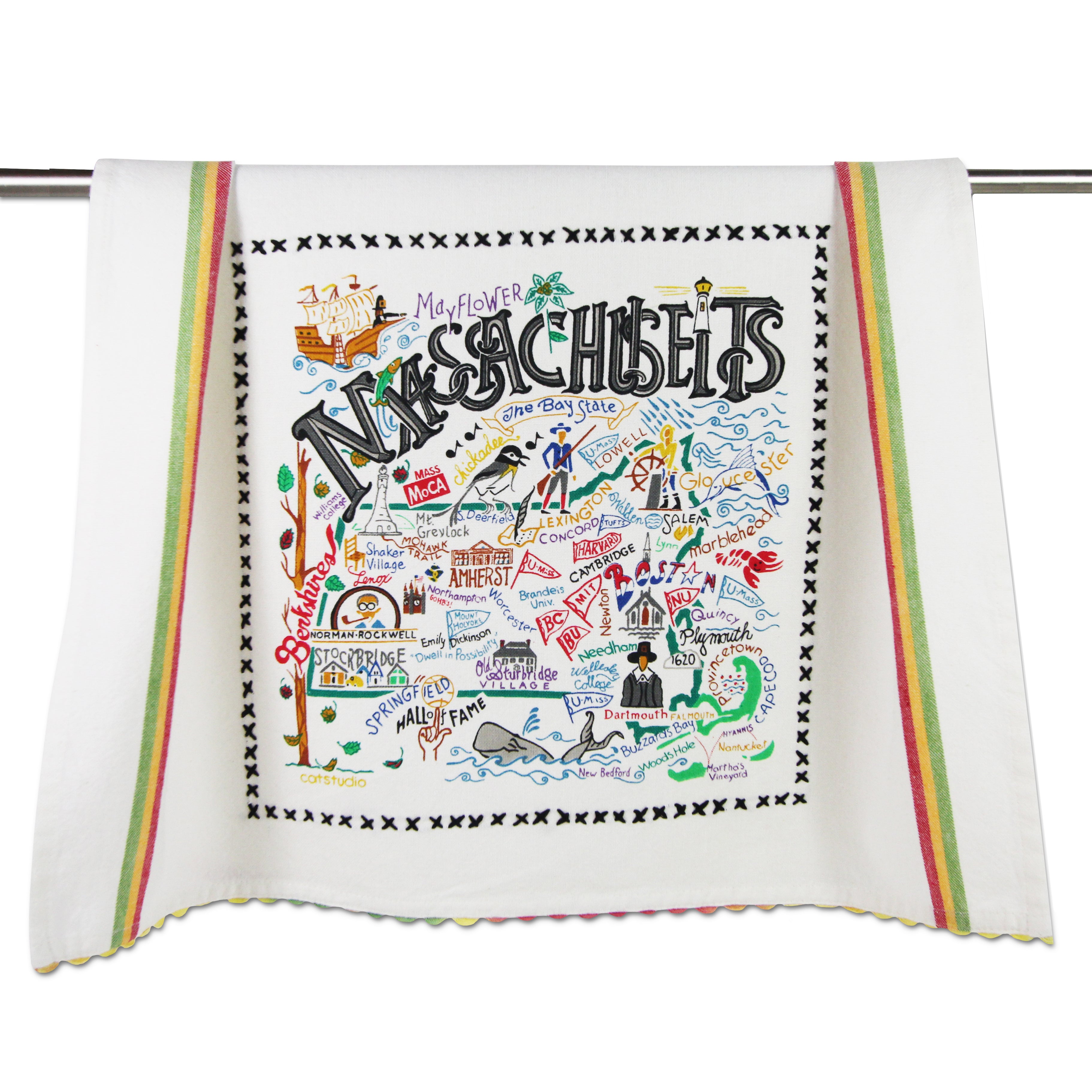 This colorful Massachusetts design is silk-screened, then framed with a hand embroidered border on a 100% cotton dish towel. Three stripes down both sides and hand dyed rick-rack at the top and bottom add a charming vintage touch. Delightfully presented in a fun & fabulous organdy re-usable pouch!