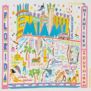 This colorful Miami design is silk-screened, then framed with a hand embroidered border on a 100% cotton dish towel. Three stripes down both sides and hand dyed rick-rack at the top and bottom add a charming vintage touch. Delightfully presented in a fun & fabulous organdy re-usable pouch!