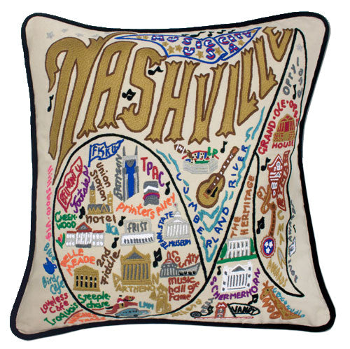 This Nashville pillow is a delightful keepsake for remembering where you came from, where you've been, where you are, and where you'd like to go! Great for gift giving, or to adorn your own comfy, cozy couch. Each and every pillow is entirely embroidered by hand, and is finished with velvet piping around the edges.