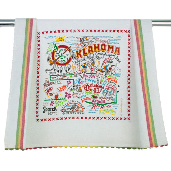 This colorful Oklahoma design is silk-screened, then framed with a hand embroidered border on a 100% cotton dish towel. Three stripes down both sides and hand dyed rick-rack at the top and bottom add a charming vintage touch. Delightfully presented in a fun & fabulous organdy re-usable pouch!