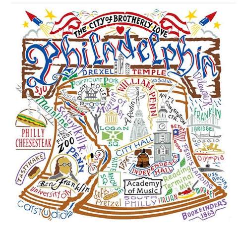 This colorful Philadelphia design is silk-screened, then framed with a hand embroidered border on a 100% cotton dish towel. Three stripes down both sides and hand dyed rick-rack at the top and bottom add a charming vintage touch. Delightfully presented in a fun & fabulous organdy re-usable pouch!