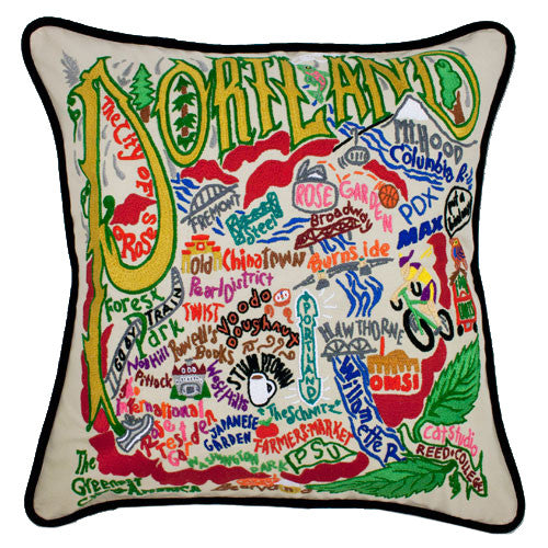 This Portland pillow is a delightful keepsake for remembering where you came from, where you've been, where you are, and where you'd like to go! Great for gift giving, or to adorn your own comfy, cozy couch. Each and every pillow is entirely embroidered by hand, and is finished with velvet piping around the edges.