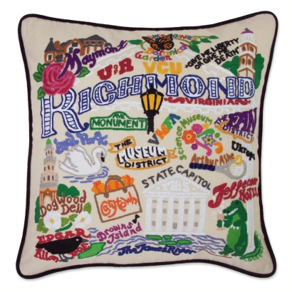 This Richmond pillow is a delightful keepsake for remembering where you came from, where you've been, where you are, and where you'd like to go! Great for gift giving, or to adorn your own comfy, cozy couch. Each and every pillow is entirely embroidered by hand, and is finished with velvet piping around the edges.