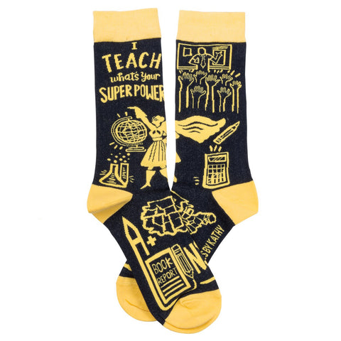 These colorful socks feature woven designs with coordinating "What's Your Super Power" sentiment. Cotton, nylon, spandex. One size fits most.