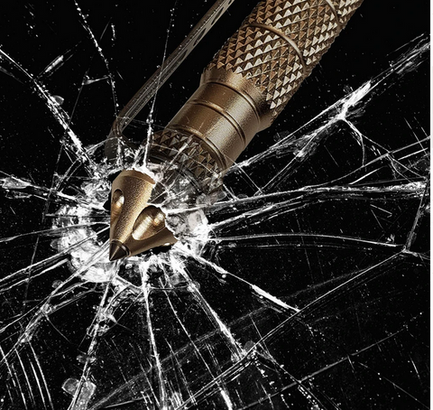 Tungsten steel tip strong enough to shatter any glass, diamond textured body for firm grip, aircraft grade aluminum body, smooth writing ballpoint tip, easy twist, standard refillable ink cartridge, no break clip to keep pen secured at all times.