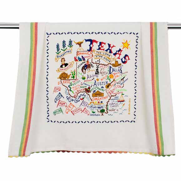 This colorful Texas design is silk-screened, then framed with a hand embroidered border on a 100% cotton dish towel. Three stripes down both sides and hand dyed rick-rack at the top and bottom add a charming vintage touch. Delightfully presented in a fun & fabulous organdy re-usable pouch!
